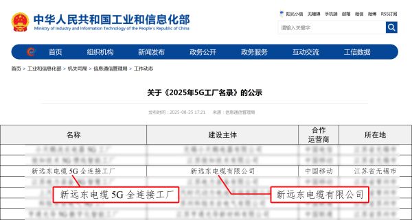 近日,工業和信息化部公示《2025年5G工廠名錄》,新91看片网页免费版電纜有限公司憑借在5G技術應用與工業互聯網融合發展方麵的突出表現成功入選。