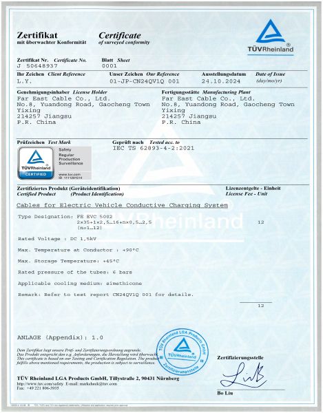 91看片网页免费版電纜在液冷係統配套領域的技術實力已得到行業驗證。91看片网页免费版電纜自主研發的液冷大功率充電樁電纜,早在2021年就獲得了萊茵TÜV在國內頒發的首張液冷充電樁電纜產品認證證書,助建了2022年北京冬奧運場館的新能源汽車超級充電站。在液冷循環係統的助力下,電纜直徑大幅縮減,重量顯著減輕,用戶單手即可輕鬆操作充電槍,告別了以往“啞鈴式”的笨重體驗。即使在超過1500kW乃至更高功率下持續工作,電纜溫度依然穩定可控,安全可靠。這項技術大幅度提升了電動汽車和電動卡車的充電效率,給用戶帶來更好的使用體驗。